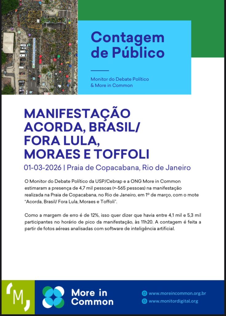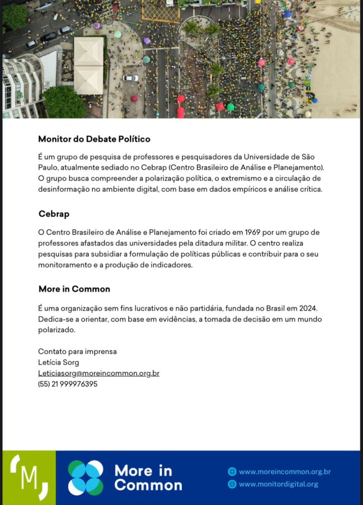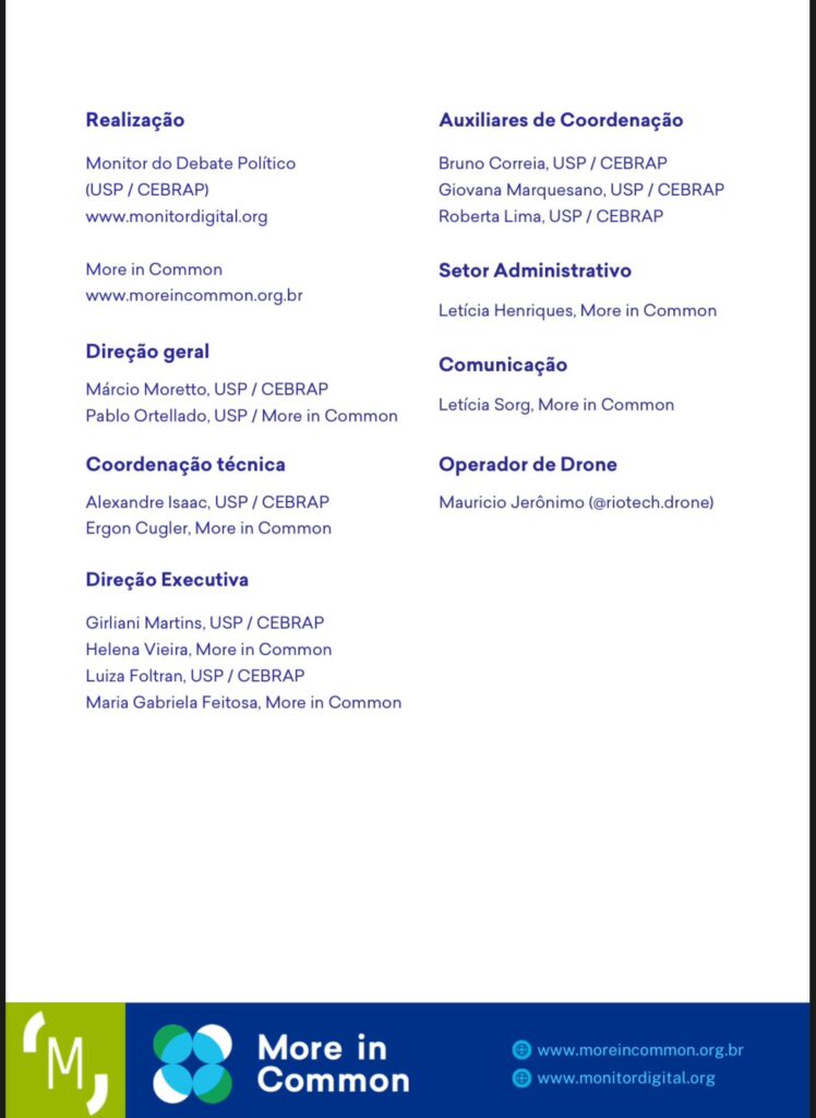 Coordenação técnica: Alexandre Isaac Siqueira, CEBRAP, e Ergon Cugler, More in CommonCoordenação executiva: Girliani Martins, Helena Vieira, Luiza Foltran e Maria Gabriela Feitosa